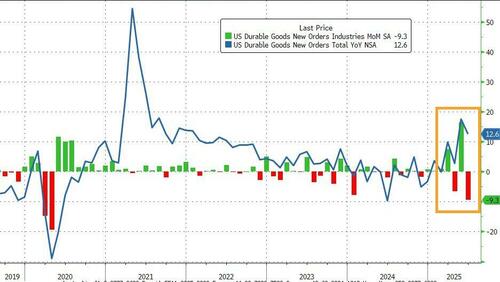 Durable Goods Orders plunged 9.3% MoM (slightly better than the -10.7% MoM expected) – the biggest drop since the COVID lockdowns. But as the chart below shows, it is a wildly noisy time series, almost entirely due to the lumpiness of aircraft orders…
