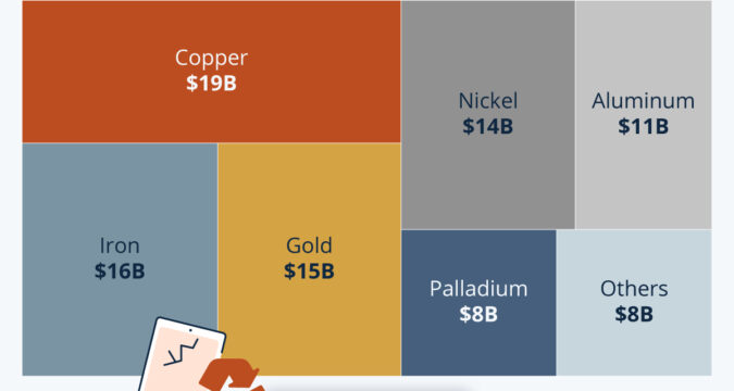 As Statista’s Felix Richter sums up in the following chart, the estimated value of metals contained in e-waste in 2022 was $91 billion, with copper, iron, gold and nickel the most valuable components.