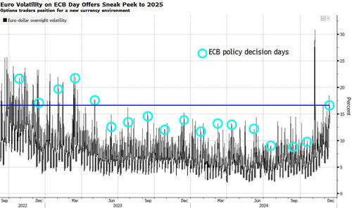 Options traders see the euro moving by the most since May 2023 on the day of a European Central Bank meeting, even amid market consensus on the policy decision. It’s mostly about forward-guidance expectations and a new FX volatility environment that’s been shaping up since the US elections.