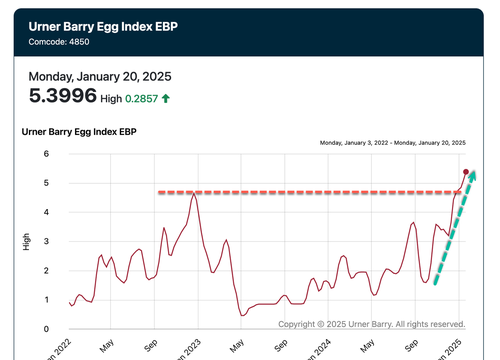 The latest wholesale data from Urner Barry shows that the price for a dozen eggs has jumped to a record high of $5.4, exceeding the previous peak of $4.65 set in December 2022. Rising wholesale prices are expected to continue pressuring supermarket prices higher.