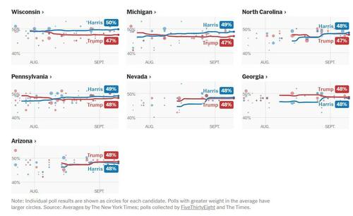 Back in September, based on the aggregate polls, Vice President Kamala Harris enjoyed slim leads in the majority of swing states – Wisconsin, Michigan, North Carolina, and Pennsylvania – and was essentially tied with Trump in Nevada, Georgia, and Arizona.