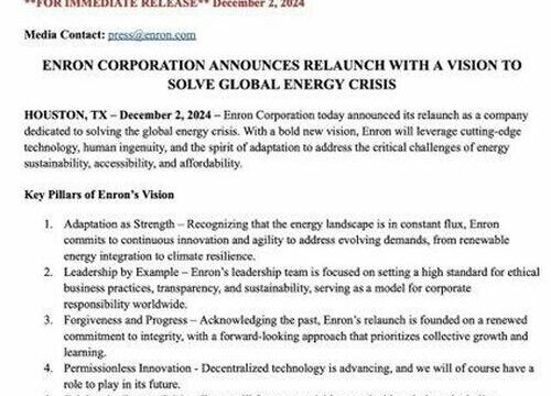 On its website, “Enron.com,” the company, supposedly operating as “Enron Corporation,” published what could be described as one of the laziest press releases imaginable, with formatting that resembles something generated by ChatGPT…