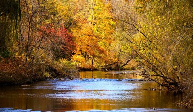 Trees burst with autumn colors Tuesday, Oct. 28, 2025, along the Little Lehigh Creek in Allentown. (April Gamiz/The Morning Call)