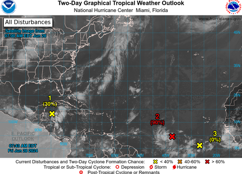 As of 0800 ET, NHC said the tropical wave about 1500 miles east-southeast of Windward Island is “gradually becoming better defined,” indicating a 90% chance of strengthening into a tropical depression or storm over the next 48 hours.