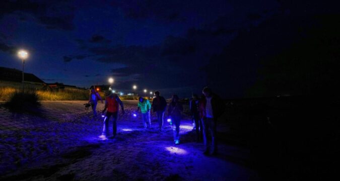 Participants hold a glass of salt water and a black light lamp in their hands to examine amber during a guided amber hunt for tourists on the beach of the Baltic Sea resort of Dahme, Germany, Tuesday, Sept. 2, 2025. (AP Photo/Markus Schreiber)