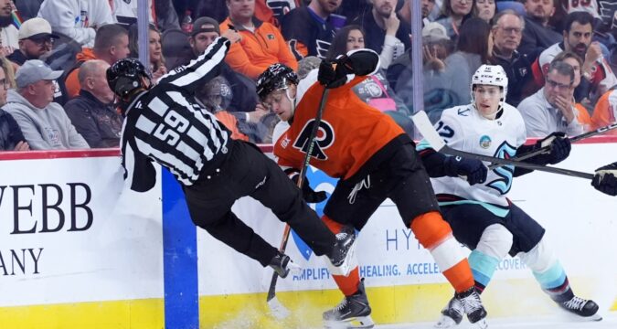 The Flyers didn’t need long to respond. Daccord fumbled the puck at the side of the net. Philly took control. Nick Seeler’s entry was tipped into the net by Tippett.