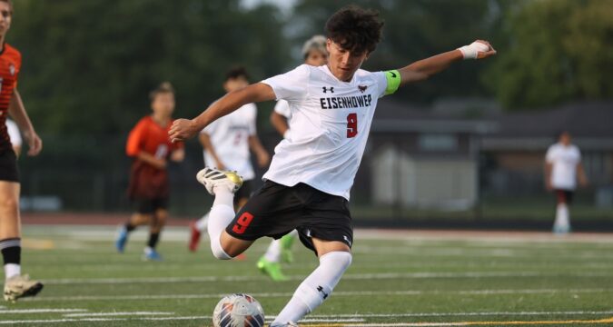 Eisenhower’s Manny Montano (6) takes a free kick against Shepard during a South Suburban Red game in Palos Heights on Thursday, Sept. 18, 2025. (Gary Middendorf / Daily Southtown)