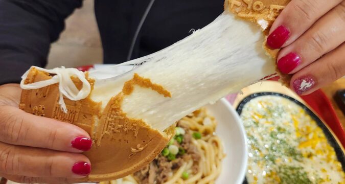 Along with many beverages (the grapefruit sparkle tea with passionfruit boba, 0% sweet, was delightful!) is the viral sensation that launched a thousand TikToks. And get this: It’s really tasty! Crisp, beautifully detailed crepe circles, lightly sweet, mask a cascade of mozzarella that’s warm enough for an impressive pull even after navigating your way back to the food court.