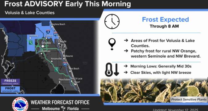 Frost is expected through 8 a.m. in Volusia and Lake counties, with temperatures in the morning generally around the mid-30s.