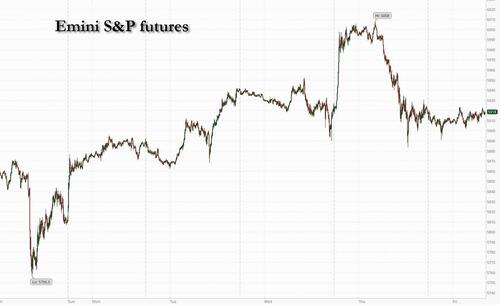 US equity futures are in the red but well off session lows, with tech leading and small caps lagging. As of 8:00am S&P futures are down -0.1% at 5,917 having earlier dropped as much as 0.5%; according to Goldman, US equities are “not reacting well” to i) “Plan B” article from the WSJ (which recaps what we said here) that “the administration is considering a stopgap effort to impose tariffs on swaths of the global economy under a never-before-used provision of the Trade Act of 1974, which includes language allowing for tariffs of up to 15% for 150 days to address trade imbalances with other countries”, and 2) a Reuters article quoting Bessent that US-China tariff talks are “a bit stalled.” Pre-market Mag 7 are mostly lower with TSLA -1.4%, NVDA -0.6% and META -0.4%. Bond yields are largely unchanged with the 10Y trading at 4.42%; the USD is modestly higher against G7 peers. Commodities are mixed with oil higher and metals lower. Today, macro focus will be on the April PCE and the final Michigan survey; tomorrow, OPEC+ will meet to decide on July output.