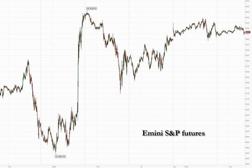 US stock futures swung between gains and losses after a two-day advance as traders focused on signs that the Trump administration may add more tariff exemptions to ease the economic turmoil of the trade war. As of 8:00am S&P 500 were down -0.3% and Nasdaq futures dipped -0.2%, although both indexes were in the green just minutes earlier with moves now happening so fast and jittery, it has become meaningless to keep tabs. Boeing sank 4% in premarket trading after China ordered airlines not to take any further deliveries of the company’s jets; elsewhere, Mag7 and Semis are leading TMT higher with Fins higher into earnings. Other Cyclicals like Energy/Industrials are mixed with Materials higher led by gold miners. In Europe, stocks pushed higher after Trump floated a pause in auto tariffs. Bond yields are +/- 1bp as the curve twists flatter; USD is flat as it looks to ease 5 consecutive days of losses. The commodity complex is weaker with crude and base weaker, gold up, and Ags mixed. The macro data focus is on import/export prices and Empire Mfg plus earnings from GSIB Banks, transports, and a HC (and Defensives factor) bellwether, JNJ.