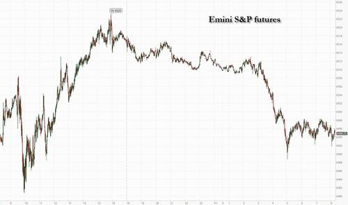 US equity futures are lower after closing at a new all time high, dragged by tech stocks as traders cut risk ahead of today’s core PCE data that may test expectations for the pace of Fed rate cuts. As of 8:00am ET, S&P futures are down 0.3% and Nasdaq futures fell 0.5%: in premarket trading, Alphabet dropped 1.2% leading losses among the Magnificent Seven giants; Nvidia shares extended their premarket decline to over 1%, after the Wall Street Journal reported Alibaba had created a new AI chip. Dell slumped more than 6% after reporting slower sales of artificial intelligence servers. Europe’s Stoxx 600 also dropped 0.4% while bond markets weakened across the board amid ongoing political turmoil in France. US Treasuries fell, with the yield on 30-year notes rising three basis points to 4.90% while the dollar gained 0.2%, putting it on track to snap a run of three weekly losses. Attention today will be on the July personal income/spending which includes the Fed’s favorite core PCE data; we also get the advance goods trade balance and wholesale inventories (8:30am), August MNI Chicago PMI (9:45am, several minutes earlier to subscribers), August final University of Michigan sentiment (10am) and Kansas City Fed services activity (11am).