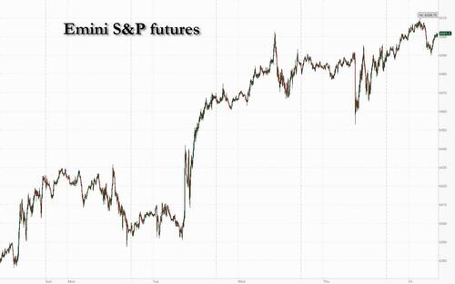 US equity futures are slightly higher , hovering near all time highs as traders bet that data on Friday will bolster the case for interest rate cuts even as the latest BofA card data hints at a big beat in today’s retail sales print (see preview here); tech stocks lag. As of 8:00am S&P futures are 0.2% higher following back-to-back record closes earlier in the week, with Nasdaq futures modestly in the red after incremental headlines since yesterday’s close which were net negative, with soft guidance from AMAT on uncertain macro environment in Semis and weaker China activity data. Pre-market, NVDA fell 0.3%, with the rest of Mag 7 moving higher; Health Care and Financial are outperforming. Intel rose more than 3% in premarket trading on a report that the US government may buy a stake in the struggling chipmaker. US Treasuries are mixed, with the yield on two-year notes falling one basis point to 3.72%. The yen led gains among major currencies against the dollar as the greenback weakened 0.3%. Commodities are mixed, with precious metals higher and base metals lower. Today, key macro focus will be Retail Sales and Trump-Putin Summit.