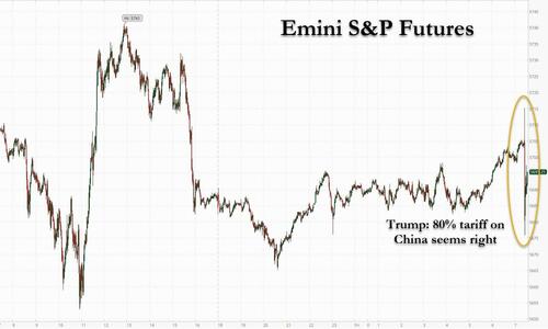 US equity futures traded modestly higher pointing to a third day of gains, until just before 730am ET when Trump decided to play bad cop to Scott Bessent’s good cop and posted on Truth Social that “80% Tariff on China seems right!” but then added that the final tariff rate is “Up to Scott B.”
