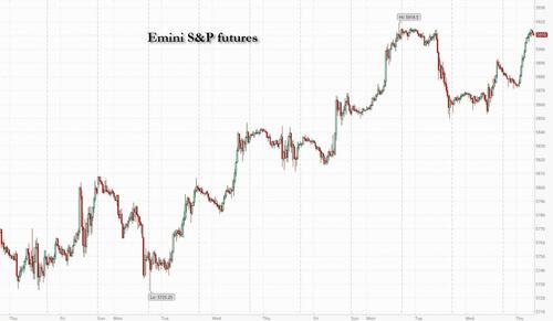Futures are higher and on the verge of another all time high with Tech leading: NVDA is up +2.5% pre-market as TSMC reported strong upside on margin, along with comments on “extremely robust AI related demand”. As of 8:00am, S&P futures rose 0.4% to 5,910, just shy of the 5,918 all time high; Nasdaq 100 futures climbed 0.9%, led by an advance in chip stocks after TSMC posted a better-than-projected 54% rise in quarterly earnings. That helped reverse the impact of ASML Holding NV’s lowered 2025 guidance, which halted a rally that had pushed US-traded shares to a three-month high. Europe’s Stoxx 600 index gained 0.7% ahead of the ECB’s second consecutive rate cut. China stocks extended their post-euphoria slump and erased gains on disappointment over the outcome of a joint ministry press briefing about the property market which again lacked critical details on the stimulus package. Iron ore tumbled to a three-week low ahead of data on Friday which is expected to show the economy grew at its weakest pace in six quarters. Bond yields are higher and USD is lower; 10-year yields are 2bp higher to 4.03%. Commodities are mixed: Oil and base metals are higher, while precious metals are lower.