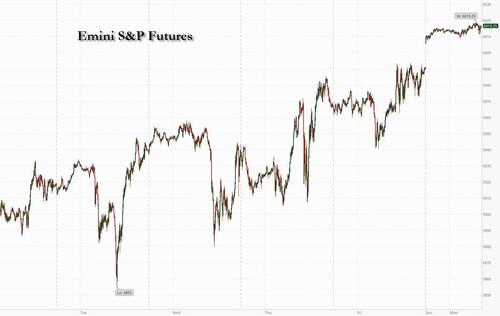 US equity futures jumped, led by a rally in small caps, as Wall Street cheered Trump’s selection of Scott Bessent as the next Treasury Secretary. As of 8:00am ET, S&P 500 futures rose 0.5% to trade at 6,016, while Nasdaq 100 futs gained 0.6% with all Mag 7 stocks higher led by the +2.0% gain in TSLA; Russell 2000 futures benefited the most rallying over 1%. Traders bet that Bessent, who manages macro hedge fund Key Square Group, will follow through on the Trump’s initiatives to lower taxes but also instill a sense of stability into financial markets (a two-pronged task which some say is a Catch 22). 10-year TSY yields dropped by five basis-points to 4.35% (but were off session lows), as Bessent’s nomination eased fears about persistent inflation under Trump’s protectionist policies. The dollar declined while Bitcoin rebounded from a weekend drop. There was also broad weakness in commodities: oil, base metals, precious metals (gold -1.7% pre-market) are all lower. It is a holiday-shortened week due to Thanksgiving holidays (US markets will close on Thursday and will close at 1:00pm on Friday) with light catalysts: we will receive the FOMC Minutes on Tuesday and October PCE on Wednesday.