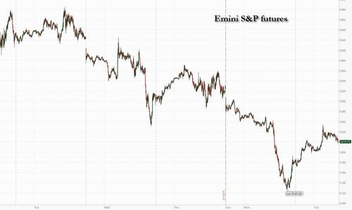 US equity futures are higher, attempting to pare back some of the sharp losses from Monday’s prior session and extending yesterday’s late day buying where the S&P found support at the 5,100 level; according to JPM, there is some optimism around a trade deal with either Japan or India and a deal is a likely milestone for stocks to finally bottom. As of 8:00am ET, S&P and Nasdaq futures are are up 0.8%, off session highs of 1.3%, with Mag 7 and Semis all higher with TSLA earnings after the close. This week 25% of the S&P reports with implied vols among the highest since peak-COVID. Chinese tech names are reportedly considering US listings despite “market ructions”, via Bloomberg citing sources; Walnut Coding, CloudSky, Zaihui & Zhonghe said to be considering IPOs in the US. The yield curve is twisting flatter and USD seeing a bid following 4 days of losses. The commodity space is mostly higher led by Energy but gold remains the top story as it set a new ATH rising above $3500 before easing back. The macro data focus is on regional Fed activity indicators (Philly non-mfg and Richmond Fed at 8:30am/10:00am ET), but the more impactful data is tomorrow’s Flash PMI prints. We also get a slew of Fed speakers (see below) alongside numerous heavyweight earnings including Tesla.