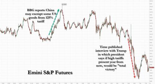 US equity futures are mixed after three days of gain, with tech leading, highlighted by GOOG (+5.6% amid strong earnings results last night), META (+3.5%), and TSLA (+1.6%). S&P futures first rose to session highs during the Asian session, when sentiment was first buoyed by dovish remarks from Fed officials Christopher Waller and Beth Hammack, which bolstered expectations for a potential interest-rate cut as soon as June; but the session highlight was a Bloomberg report that China was considering suspending its 125% tariff on some US imports including plane leases, indicating a shift in the game theoretical “game of chicken” balance and suggesting a deal may come sooner than expected as pain levels are rising for Beijing. Later, foreign ministry spokesman Guo Jiakun reiterated that China is not in talks with the US over tariffs, contradicting Trump and underscoring the complexities for investors tracking headlines out of Washington and Beijing. Futures then slumped to session lows just after 6am ET after Time published an interview with Trump (which took place on April 22) in which the president said China’s President Xi has called him (something China denies), said he would not call XI himself, and when asked if high tariffs are still present a year from now, Trump said that would be a “total victory” adding that he expects trade deals in the next 3-4 weeks. In other words, if China may have been offering an olive branch before the interview, those hopes were dashed after its publication and S&P futures reflected that, sliding to session lows down about 0.4% after earlier they rose by the same amouint.