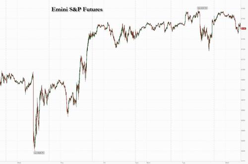 US equity futures are lower ahead of today’s FOMC minutes, with global markets also sinking and bonds extended their slide after President Trump’s latest tariff threats stoked concern about a widening trade war; hawkish UK inflation prints which sent bond yields higher did not help. As of 8:00am S&P futures are -0.3% lower after the index topped its January record on Tuesday, while Nasdaq futures traded steady after Trump raised the specter of 25% tariffs on Autos and Pharma, both coming after April 1. The Trump Admin will also keep Biden-era rules on M&A. A slew of earnings reports also dented sentiment, with Arista Networks, Occidental Petroleum, Celanese and Bumble all dropping in premarket trading after results. Super Micro Computer rallied, however, after issuing an aggressive long-term revenue outlook. Pre-mkt, Mag7 names are mixed with Semis seeing some profit-taking. The yield curve is twisting steeper as the USD appreciates. Commodities are stronger despite the USD move; Brent trades above $76 while gold is at an all time high around $2940. Today’s macro data focus will be on Housing data and the Fed Minutes.