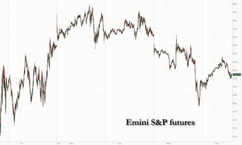 US equity futures have bounced back from yesterday’s rout, following positive signals from initial US-Japan trade talks after President Donald Trump said there was “big progress” to strike a deal fueling optimism over trade negotiations. Still, as of 8:00am they are well off their highs after DJIA heavyweight member UnitedHealthcare plunged 20% after slashing outlook on care costs and after President Donald Trump berated Federal Reserve Chair Jerome Powell for being slow to cut interest rates; S&P 500 futures rising 0.4% having earlier risen as much as 1.2%, while Nasdaq futures gained 0.8% with Mag7 names mostly higher as US-listed shares of TSMC rose 3.8% in premarket after forecasting sales for the second quarter that topped estimates. European stock fell and Asian markets rose. Volatility is becoming less extreme as the VIX retreated to around 30, down from last week’s peak of about 52. The dollar edged higher while the yen drops, lagging G-10 currencies. Gold dipped from record highs but was still trading above $3300 while oil rose for a second day after the US vowed to reduce Iran’s energy exports to zero.