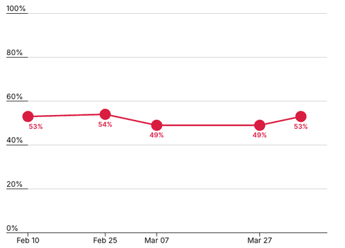It is up by 13 points since March 7 among those aged 18 to 29.