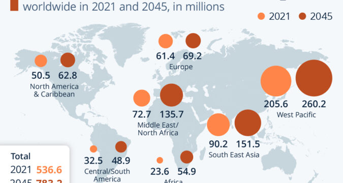 As Statista’s Anna Fleck details below, the total number of adults with the disease is projected to increase to 787 million (12.2 percent of the global population) by 2045.