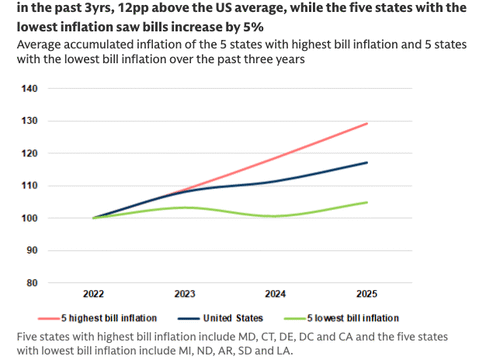 In the Northeast/Mid-Atlantic and California, we believe higher bill inflation has been a function of (1) tighter regional power markets as demand inflects from electrification, data centers, and reshoring, and as coal units are retired, driving higher capacity prices that are passed onto customers, (2) volatility in natural gas prices as well as supply constraints on domestic natural gas flows in certain regions, (3) public benefits charges that support state/federal mandates around energy efficiency, wildfire mitigation, and clean energy goals increasing on bills, and (4) higher delivery charges, as utilities invest in aging grid infrastructure. In the states that have seen lower inflation, robust local resource availability (coal/wind/gas) have helped keep electricity rates lower with ample supply.