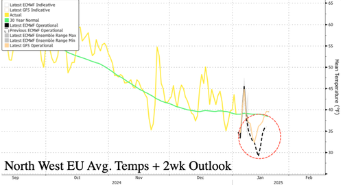 Samantha Dart, co-head of global commodities research at Goldman Sachs, said colder-than-average weather across the EU “is a stronger driver” than the halt in Russian NatGas exports via Soviet-era pipelines running through Ukraine, which will, in turn, pressure EU NatGas prices higher. By Friday, EU NatGas prices reached levels not seen in over a year, exceeding 50 EUR/MWh.