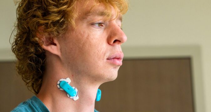 Lehigh University grad student Charles Rulon demonstrates wearable muscle sensors that make swallowing trackable Friday, Sept. 19, 2025, during a joint news conference with Good Shepherd Rehabilitation and Lehigh University announcing details of a new, 10-year partnership to advance the future of rehabilitation through joint research opportunities, tools and technology that help the lives of people with disabilities at Good Shepherd Rehabilitation Hospital in Upper Saucon Township. (April Gamiz/The Morning Call)