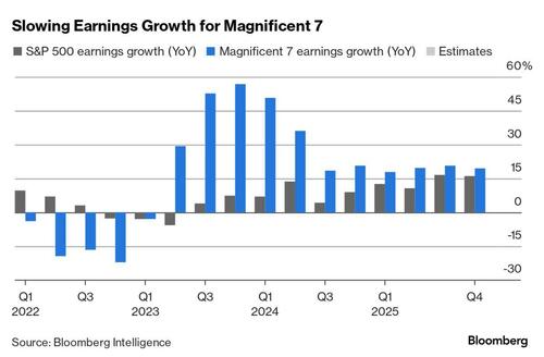 What until now was a solid, if not stellar earnings season, is about to go into overdrive as the tech giants report Q3 earnings, although unlike previous quarters, growth for the Magnificent 7 is expected to be far more subdued.