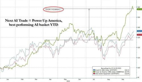 In short, the stellar returns of the “Next AI trade” in 2024 are just the start: as more capital is allocated to “those who provide the electricity to those who sell the picks and shovels for the next gold rush”, the basket will blow away every other segment of the market, and the biggest winners will be not those who bet on the revolutionary technology that is AI, but those who backed something much more promitive: the electricity needed to power it.