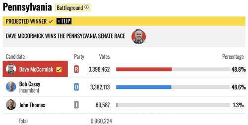 Out of nearly 7 million votes cast, Republican challenger Dave McCormick — a West Point grad, Gulf War vet and former CEO of hedge fund Bridgewater Associates — is up by just 16,000 with 99.8% of votes counted. The tiny margin — just 0.2% — triggered an automatic recount that started on Monday; an announcement of the result had been expected to come next Wednesday, but Casey’s concession ends the recount.