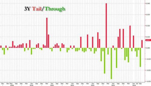 Moments ago the Treasury sold $58 billion in 3Y paper, matching the all time high issuance for the tenor, in an auction that was unexpectedly ugly. The sale stopped at a high yield of 3.878%, the highest since July, and tailing the When Issued 3.871% by 0.7bps, the first and biggest tail since June and followed the biggest stop through since August 2023.