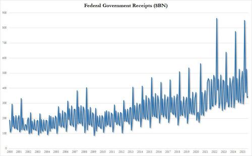 Finally, while total deficit may be lower than it was in the prior year, it is probably safe to say that gross interest will keep rising every year until the end: indeed, as shown below, at $623 billion for the first six months of fiscal 2025, cumulative gross interest was 7% higher than the $582 billion for the same period in 2025.