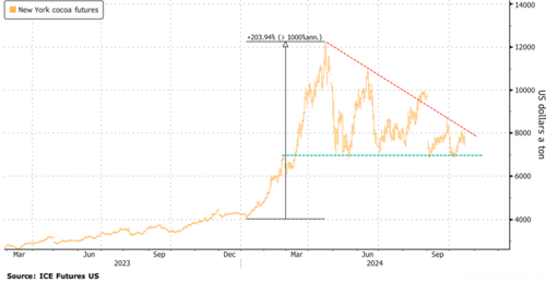 Cocoa futures in New York jumped from $4,000 per ton to as high as $12,000 earlier this year. Since April’s peak, prices have consolidated around $7,000, suggesting prices could head higher in the coming months if supplies remain low and grinding data high across the West and Asia.