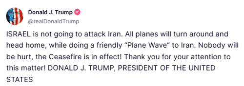 Just after the president addressed the press, Israel’s Channel 12 said IDF warplanes have launched another round of strikes against Tehran. This also just as Trump issued a new Truth Social post demanding that Israel not attack Iran. “All planes will turn around and head home,” he wrote, almost as a directive, so that “Nobody will be hurt” as “the Ceasefire is in effect!”