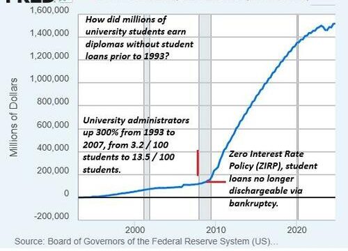 Now there’s $1.5 trillion in student loans. The number of administrators quadrupled, while federal legislation made student debt the one form of debt that cannot be discharged in bankruptcy, effectively legalizing debt-serfdom.