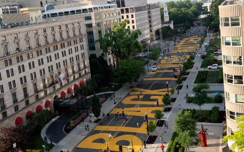 Washington, DC, painted “BLACK LIVES MATTER” across two blocks of 16th Street, near the White House, during the 2020 color revolution riots, fueled by radical leftist, taxpayer-funded NGOs. Each of the 16 bold yellow letters spans the width of the two-lane Street, creating a massive display of toxic wokeness—one that House Republicans may soon move to scrub.