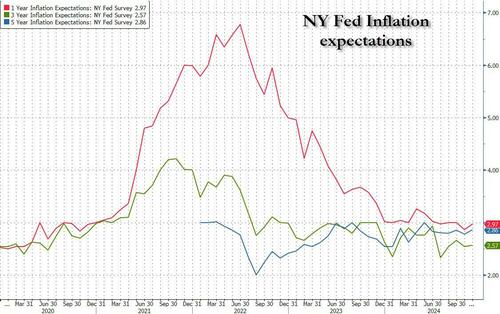 Two days ahead of the last remaining marketmoving macro event of 2024, the November CPI report, moments ago the NY Fed published its latest Survey of Consumer Expectations, which showed that inflation expectations increased by 0.1% point across all three time horizons studied in the survey, even as the Trump effect was in full force and US households now view their finances as the brightest since 2020, when Trump was also president.