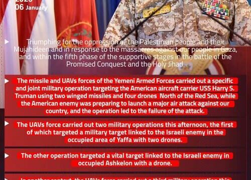 The missile and UAVs forces of the Yemeni Armed Forces carried out a specific and joint military operation targeting the American aircraft carrier USS Harry S. Truman using two winged missiles and four drones north of the Red Sea, while the American enemy was preparing to launch a major attack against our country, and the operation led to the failure of the attack.