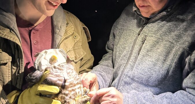 To work with the owls, Biggerstaff said he and researchers set up a net along with three speakers placed around it. When the speakers play the species’ territorial “Who cooks for you” call, it typically causes the owls to come and defend their territory. If they come in, researchers switch which speakers play the call, causing the owl to chase the sounds around.