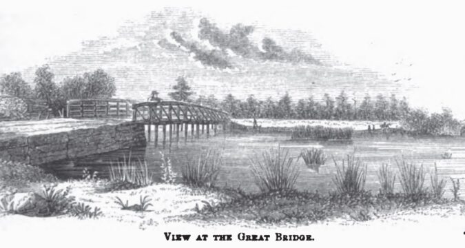 “View at the Great Bridge,” looking from the western bank, from Benson John Lossing’s book “The Pictorial Field-Book of the Revolution: or, Illustrations by Pen and Pencil of the History, Biography, Scenery, Relics and Traditions, of the War for Independence.” (Harper and Brothers, 1859). Lossing writes, “Great Bridge is the name for a comparatively insignificant structure, unless the causeways connected with it may be included in the term.” The bridge is about 40 yards long, with “extensive marshes” on each side of the river “making the whole width of morass and stream, at this point, about half a mile wide.”