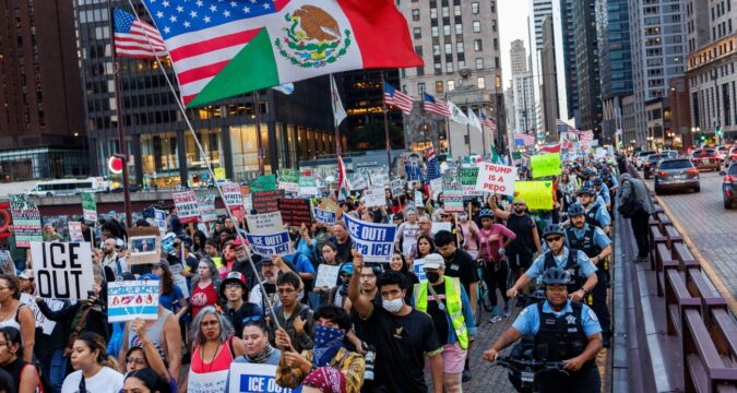 Through the same downtown streets federal immigration agents patrolled over the weekend, chants of “No ICE, no troops!” rang out Tuesday evening as hundreds marched against President Donald Trump’s recent surge in immigration enforcement locally.