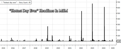 Bloomberg data shows that corporate media headlines publicizing the “hottest day ever” typically surge in June and peak during July and August, closely mirroring the height of summer in the Northern Hemisphere.