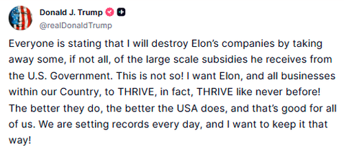 Responding to recent speculation, Trump posted on Truth Social: “Everyone is stating that I will destroy Elon’s companies by taking away some, if not all, of the large scale subsidies he receives from the U.S. Government. This is not so!”