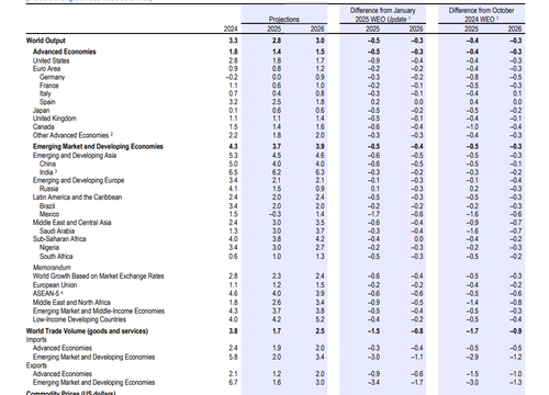 In its latest World Economic Outlook report published this morning, the IMF cut its 2025 global GDP forecast to 2.8%, and trimmed its 2026 GDP view to 3.0%. In January, the IMF predicted the world economy would expand 3.3% both this year and in 2026. The US saw the biggest growth cut, its GDP now expected to grow 1.8% and 1.7%, revised lower by 0.9% and 0.4%, respectively. The EU GDP was also trimmed but far less, to 0.8% and 1.2% in 2025 and 2026, down from 1.0% and 1.4% (expect a full-blown deflationary collapse in the old continent in a few months once China starts dumping all of its trinkets it can no longer sell in the US).