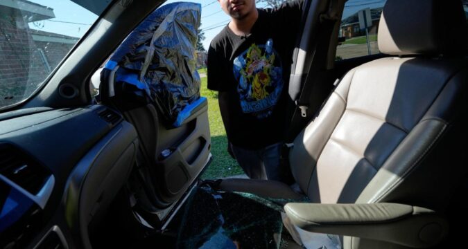 Jonathan Escalante stands over the broken window of his mother’s car, which was shattered by federal immigration agents who took her away, during a federal immigration crackdown in Kenner, La., Tuesday, Dec. 9, 2025. (AP Photo/Gerald Herbert)