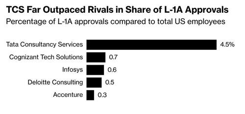 Federal data reviewed by Bloomberg indicates that TCS has received more L-1A approvals than the number of managers it disclosed to the U.S. Equal Employment Opportunity Commission, suggesting possible misuse of the visa program. TCS, which serves major U.S. tech firms, has secured more L-1A visas than any other employer in recent years.