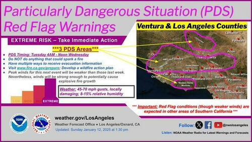 The National Weather Service has issued “Particularly Dangerous Situation” red flag warnings for the Ventura and Los Angeles counties through Wednesday. Gusts are expected to be between 50 and 65 mph, with dry air that will worsen conditions for firefighters and likely lead to more evacuations.