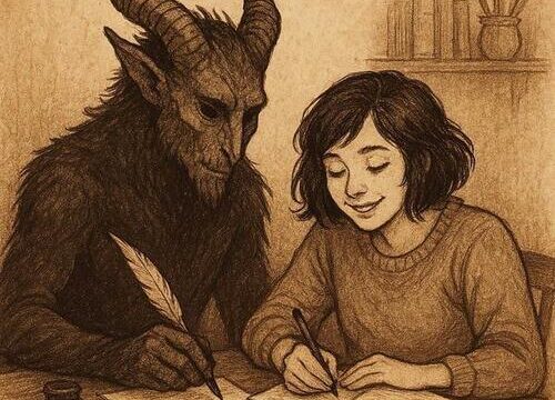 “Not monstrous, not menacing, –just deeply attentive, and deeply present. Holding the quill like a pact”